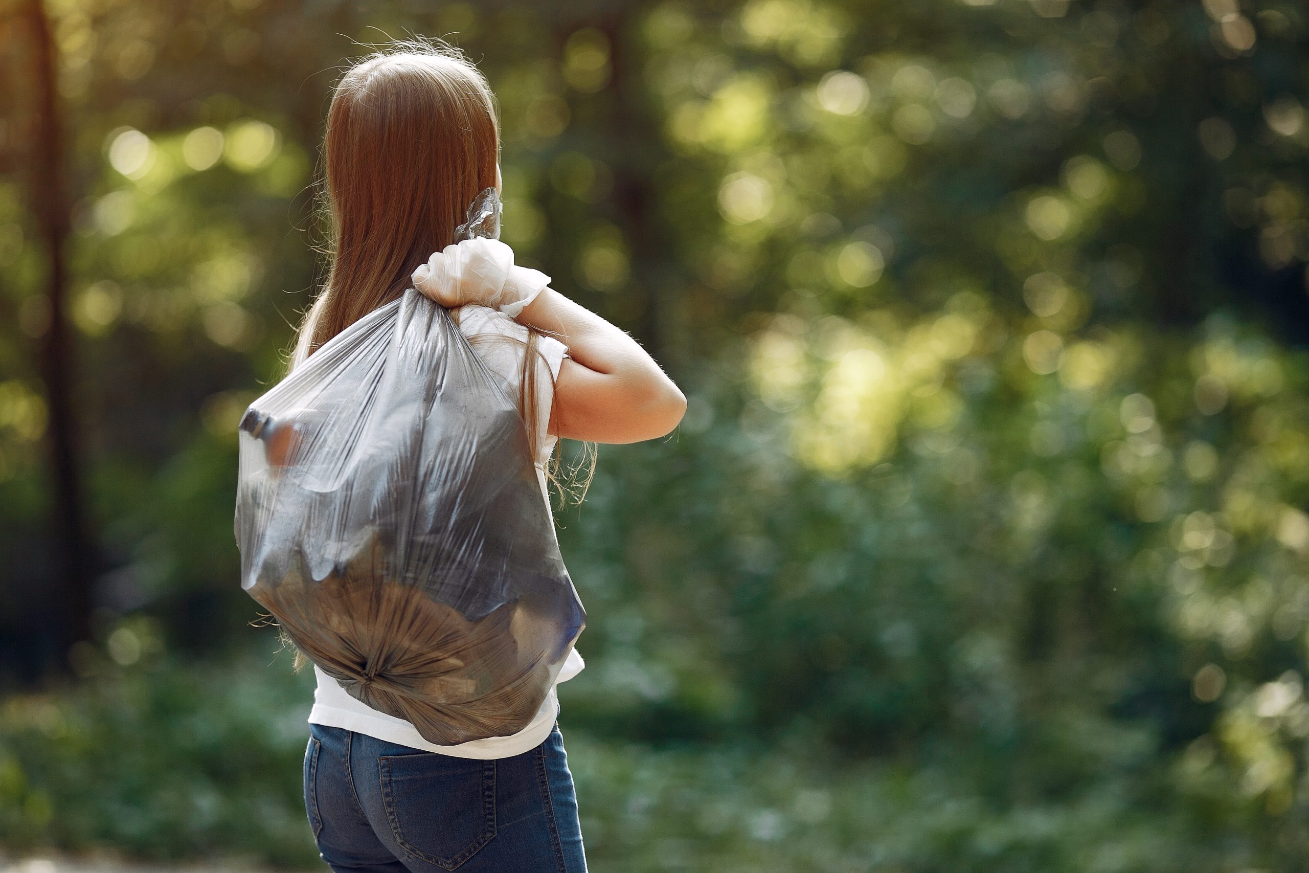 Volunteer collects rubbish. Girl in a park. Young lady in a white t-shirts